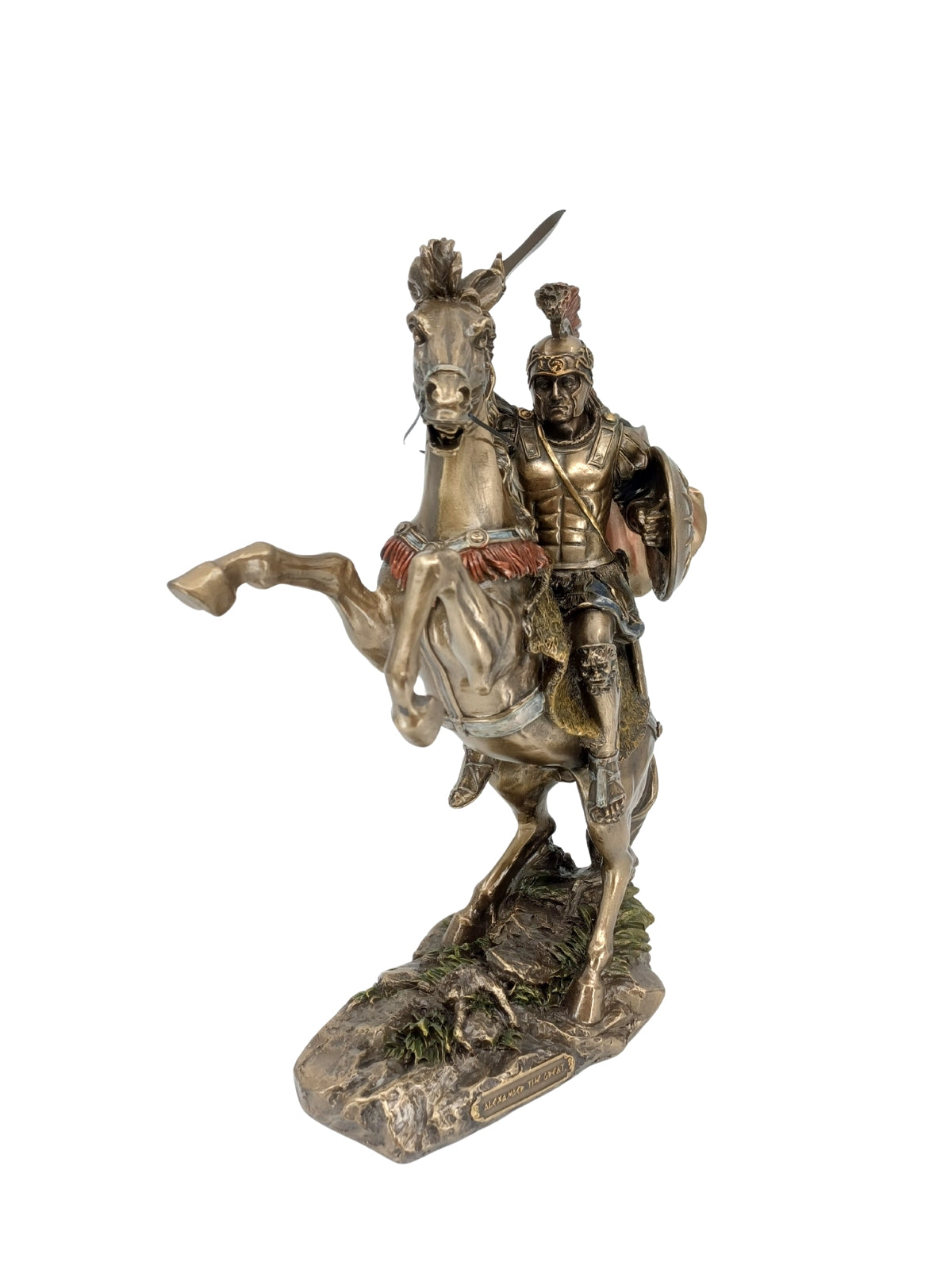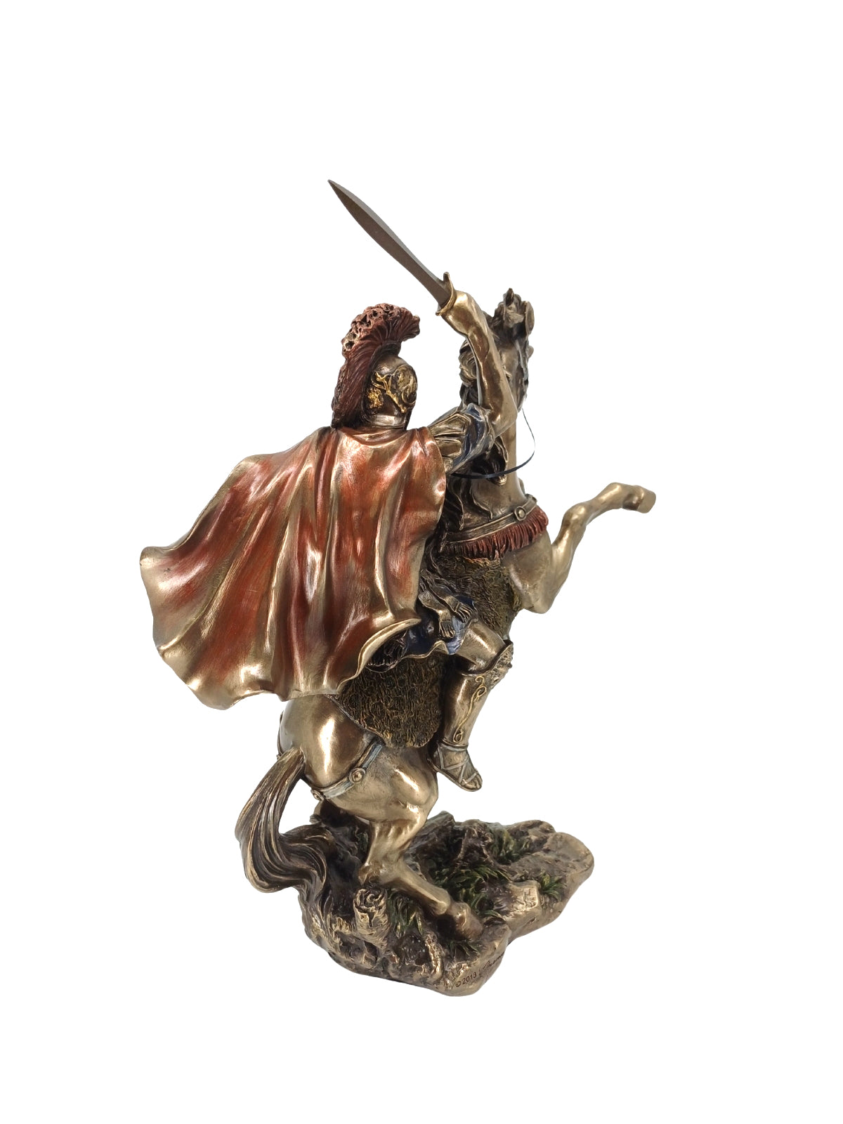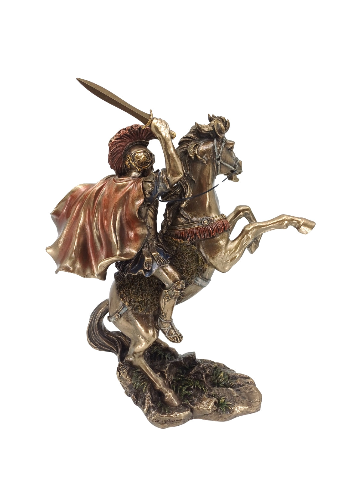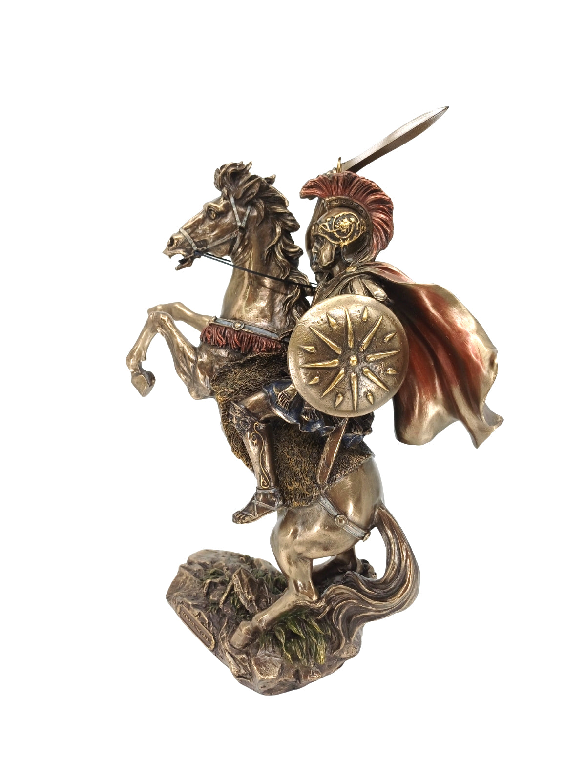 Dünya tarihinin en büyük komutanlarından Büyük İskender, bu özel Veronese Design biblosunda atı üzerinde zafer anıyla ölümsüzleştirildi. 33,5 cm yüksekliğe sahip bu koleksiyon ürünü, güçlü ve karizmatik duruşuyla tarihî bir atmosfer sunar. Soğuk döküm reçine ve mermer tozu karışımından üretilen figür, bronz tozu içeren metalik boyalarla kaplanarak klasik heykel sanatını yansıtır. El yapımı ve el boyaması olması, her bir parçayı benzersiz kılar. Yönetici ofisleri, kütüphaneler ve koleksiyon rafları için prestijli bir dekoratif obje, aynı zamanda anlamlı bir hediye seçeneğidir.