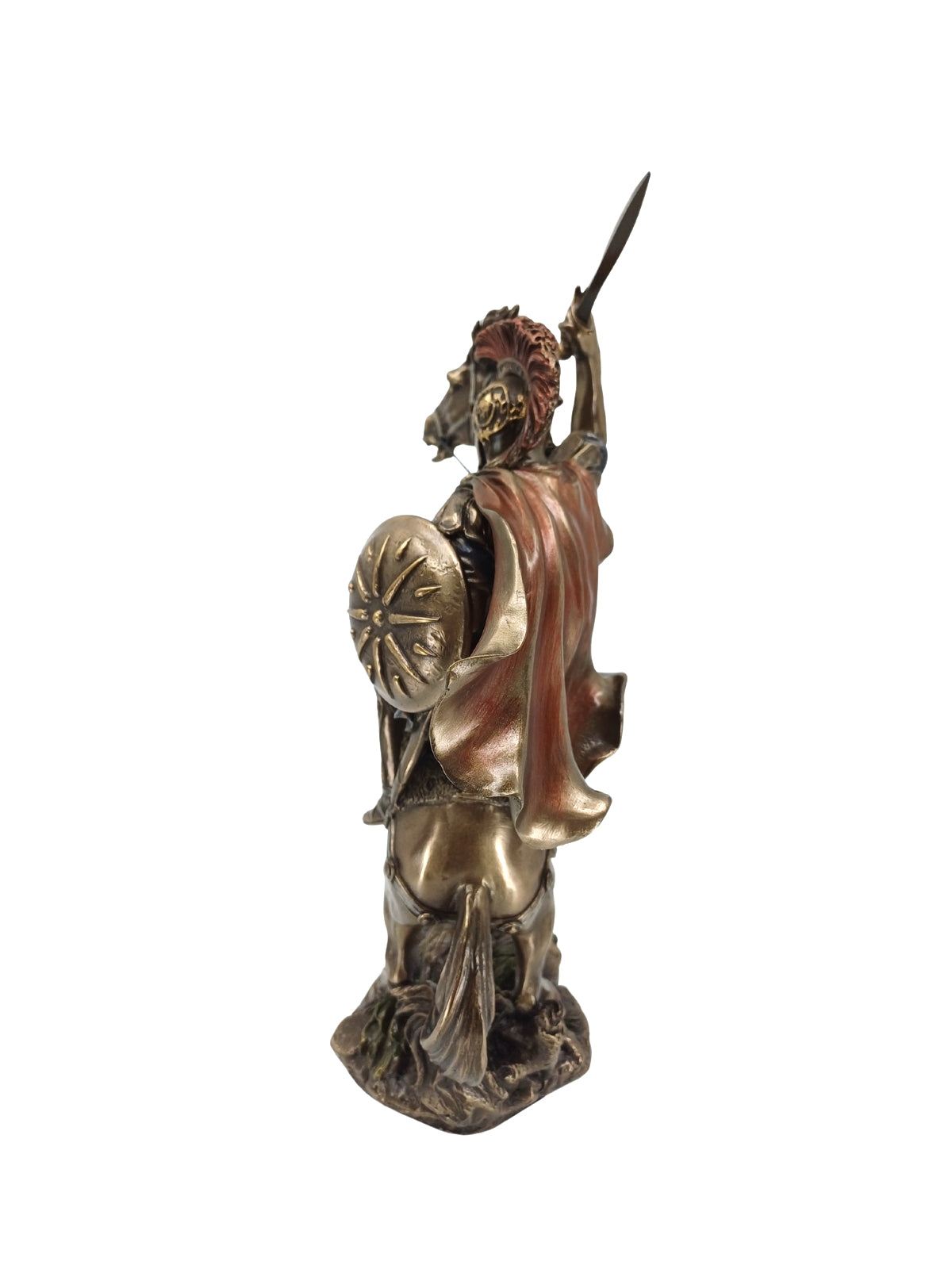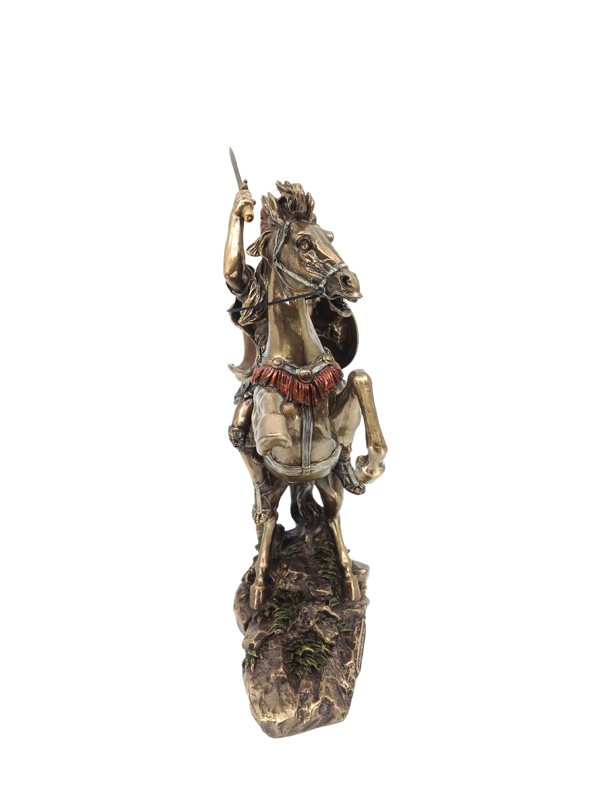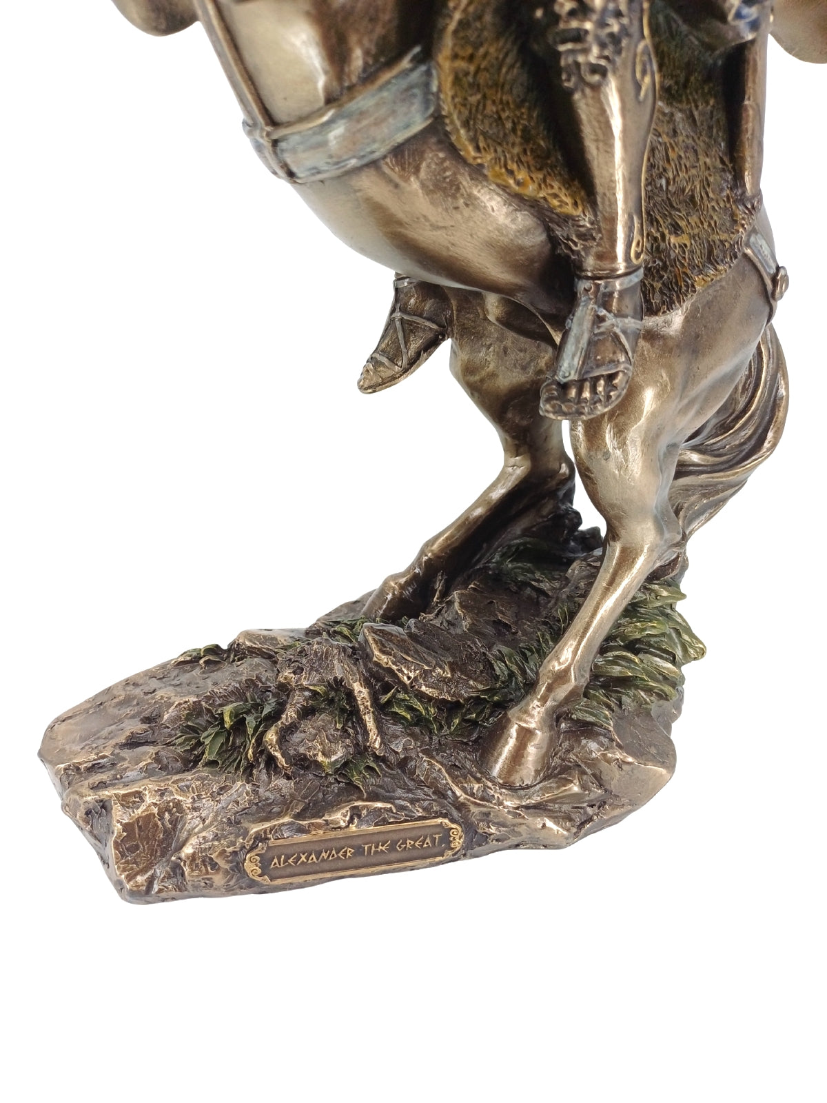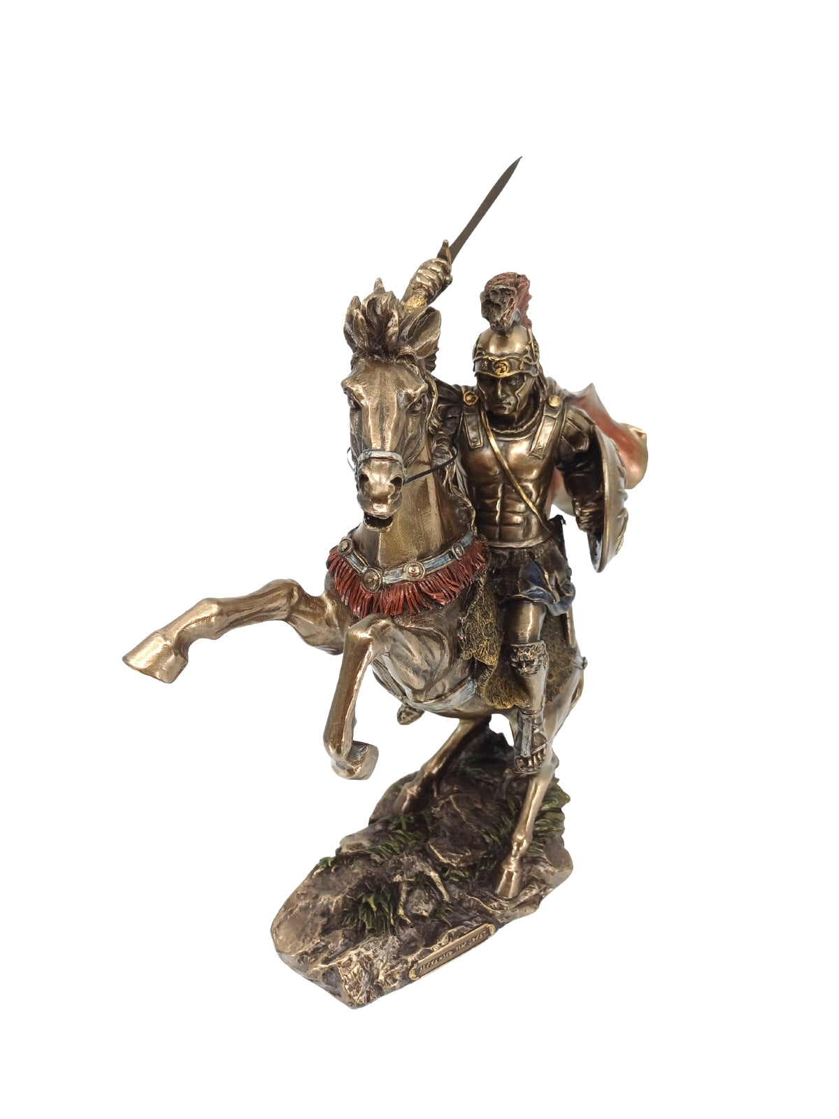 Dünya tarihinin en büyük komutanlarından Büyük İskender, bu özel Veronese Design biblosunda atı üzerinde zafer anıyla ölümsüzleştirildi. 33,5 cm yüksekliğe sahip bu koleksiyon ürünü, güçlü ve karizmatik duruşuyla tarihî bir atmosfer sunar. Soğuk döküm reçine ve mermer tozu karışımından üretilen figür, bronz tozu içeren metalik boyalarla kaplanarak klasik heykel sanatını yansıtır. El yapımı ve el boyaması olması, her bir parçayı benzersiz kılar. Yönetici ofisleri, kütüphaneler ve koleksiyon rafları için prestijli bir dekoratif obje, aynı zamanda anlamlı bir hediye seçeneğidir.